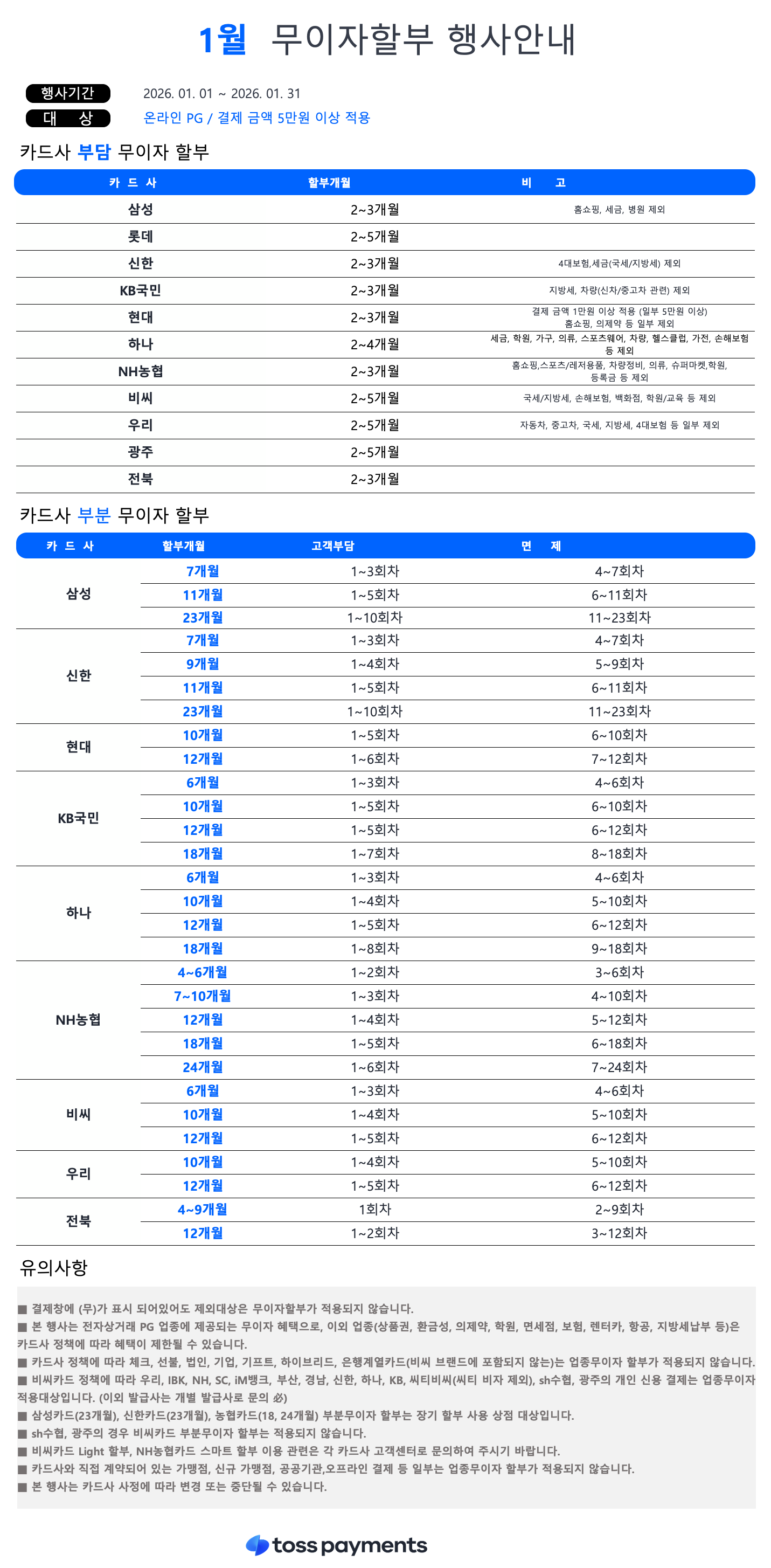 2026년 1월 카드 무이자 할부 안내 (토스페이먼츠)