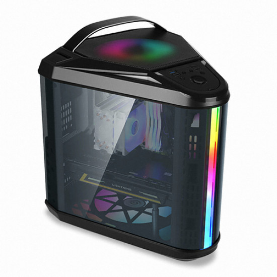 튜닝 케이스 / 지원보드규격:ATX,M-ATX,M-ITX / VGA 길이:315mm / CPU쿨러 높이:150mm / 미들타워 / [패널] / 측면 패널 타입:아크릴 / [쿨러/튜닝] / 쿨링팬:총1개 / LED팬:1개 / 상단:200mm LED x1 / [크기] / 너비(W):355mm / 높이(H):450mm / 깊이(D):415mm / [호환성] / 지원파워규격:표준-ATX / 파워 장착 길이:170mm / 파워 위치:하단후면 / [부가기능] / 외부 LED / RGB 컨트롤 / LED 색상:RGB